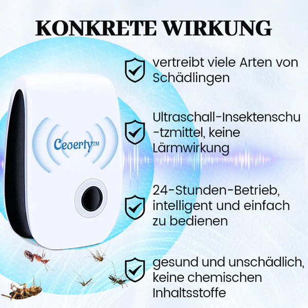 Wir stellen vor: Ceoerty™ PestOFF Ultraschall-Schädlingsvertreiber- Ihre ultimative Lösung für ein schädlingsfreies Zuhause! Verabschieden Sie sich von schädlichen Chemikalien und begrüßen Sie eine schädlingsfreie, umweltfreundliche Umgebung.