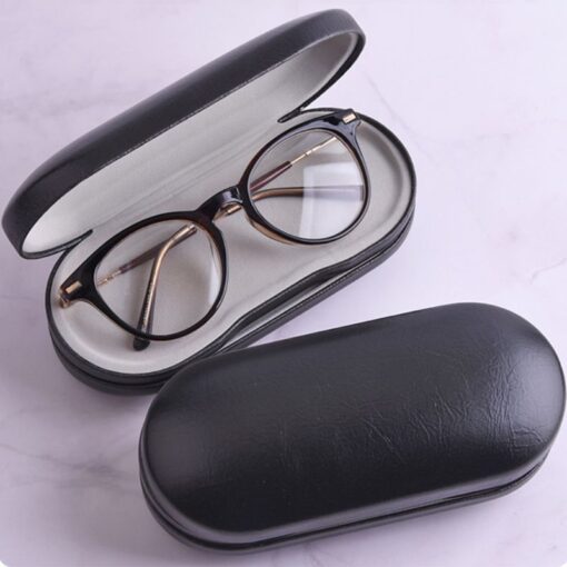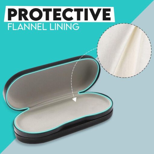 Eyeglasses are stored on one side of the case and contact lens accessories are kept on the other side. The lined eyeglass case fits most standard sized glasses and will not scratch the lenses.