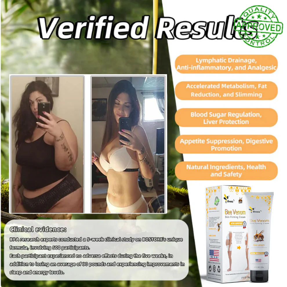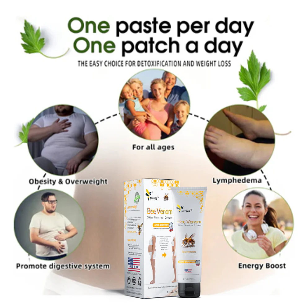 The digestive and lymphatic systems are crucial detox pathways in the body. That’s why we developed the Cvreoz™ Bee Venom Skin Firming Cream, containing bee venom and extracts of iceplant, along with four herbal extracts. These highly active ingredients are concentrated and encapsulated within the film of the cream. When used, the skin is in close contact with the cream made from natural herbs, allowing for faster and more effective penetration into the lymphatic system. By cleansing the lymph nodes to rid waste, aiding liver detoxification, and absorbing toxins, it improves metabolism, facilitating effortless fat loss, reducing inflammation, and promoting overall bodily health.