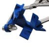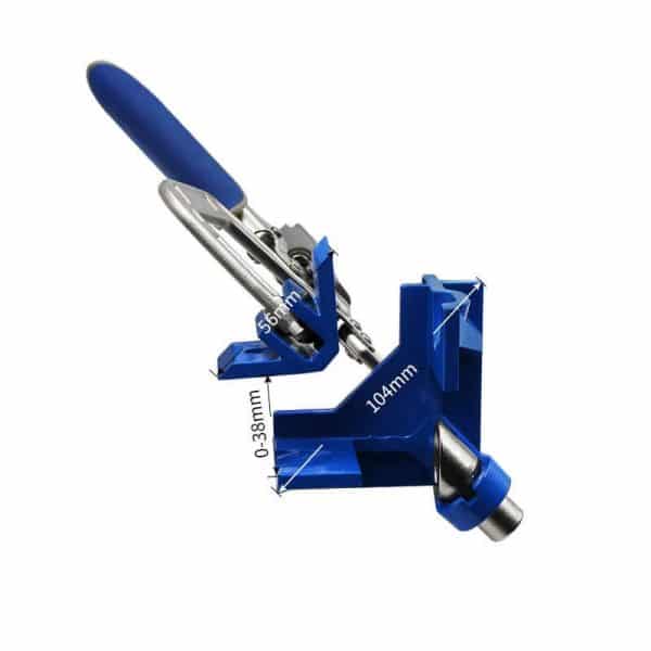 Features all-metal construction, including cast-aluminum pads—an outer “V” and inner wedge—that press against the inside and outside faces of the two pieces being joined in order to hold those pieces at a 90° angle to one another.