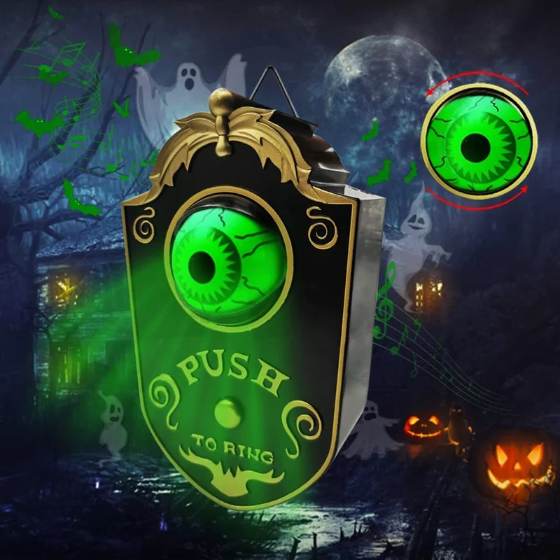Press the button on the doorbell, the eye opens with green light and turns around, making scary sounds. This scary awesome doorbell will be a horror this Halloween!