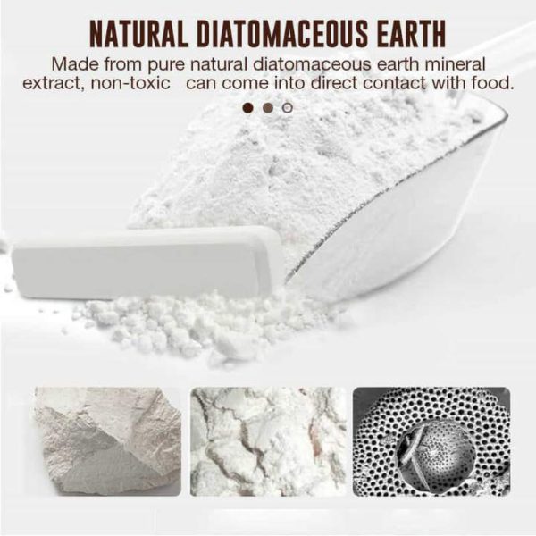 Made from pure natural diatomaceous earth mineral extract, green, non-toxic and odourless, it can come into direct contact with food.