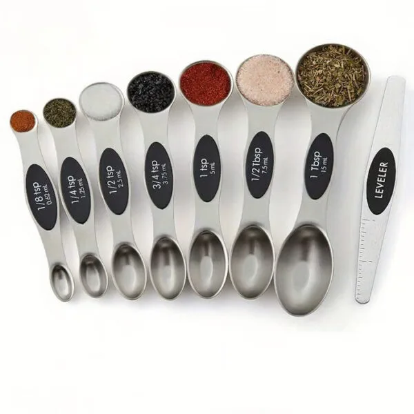 The Dual-Sided Measuring Spoons set offers 7 essential sizes: 1/8 tsp, 1/4 tsp, 1/2 tsp, 3/4 tsp, 1 tsp, 1/2 Tbsp, and 1 Tbsp, plus a Leveler to ensure precise measurements. Perfect for both daily cooking and baking needs, these spoons make your kitchen tasks easier.
