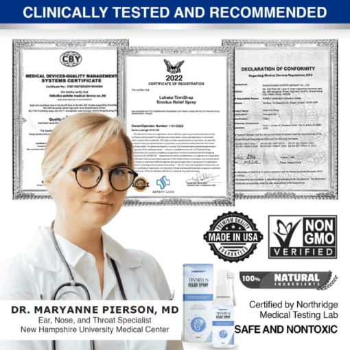 Dr. Maryanne Pierson, M.D., an otolaryngologist at New Hampshire University Medical Center in Massachusetts, and numerous other ENTs have regarded EarPure™️ Tinnitus Linderungsspray as a breakthrough solution for individuals whose tinnitus persists as a chronic hindrance. While some people may experience a reduction or relief of symptoms over time, others find that tinnitus continues to significantly impact their daily lives. EarPure™️ is considered a highly effective over-the-counter remedy, providing relief from tinnitus and its associated symptoms.