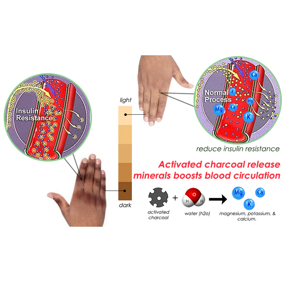 Acanthosis Nigricans Treatment Soap effectively addresses the primary reason for increased melanin, which leads to deeper skin pigmentation, by speeding up the clearance of insulin from the blood. As the activated charcoal is placed into the water, it will release minerals like magnesium, potassium, and calcium. These minerals can cultivate warming circulation within your body, which aids in stimulating the blood circulation of the body and helps reduce insulin resistance.