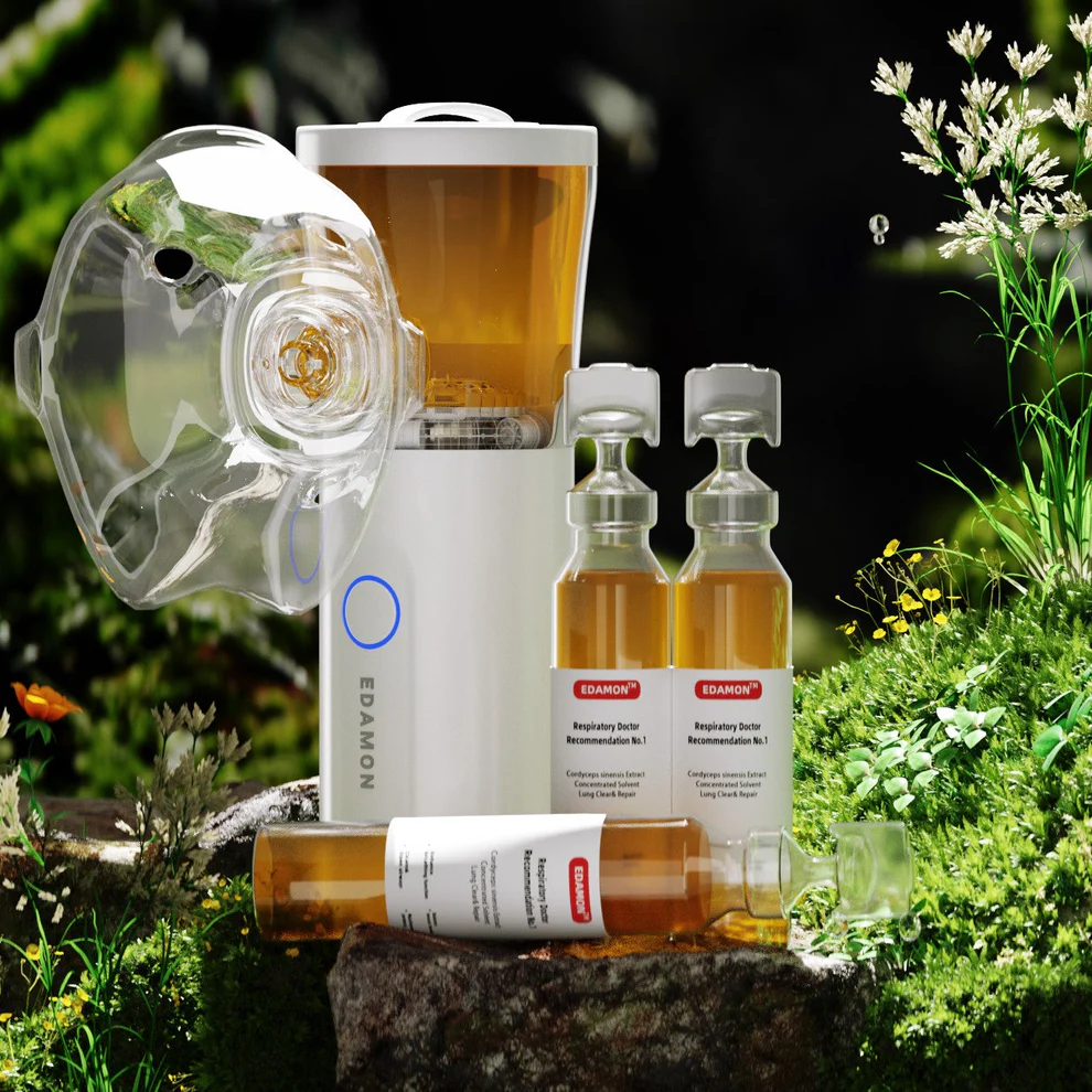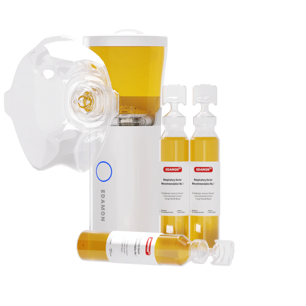 Edamon™ Compact mesh handheld portable Nebulizer is the latest portable nebulizer. It uses nano-atomization technology to convert liquid medicine into atomized form of tiny particles. When used with Cordyceps Extract Spray, it can be absorbed directly into the deep respiratory tract, helping to treat restrictive diseases. and obstructive respiratory diseases (such as asthma, pneumonia, COPD, emphysema, bronchitis, pulmonary fibrosis, and bronchiectasis), and helps inhibit proteins that cause airway allergies. By doing this, you can minimize airway irritation and improve overall lung function.