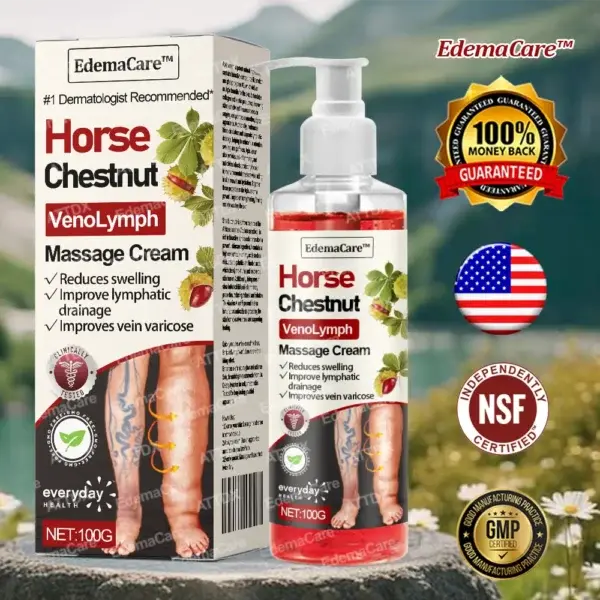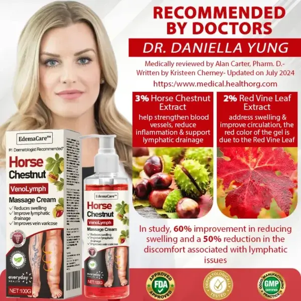 On August 13, 2024, Dr. Lily Moore, a renowned specialist at the American Institute of Vascular Health, reviewed EdemaCare™ Horse Chestnut VenoLymph Massage Cream, which contains 3% Horse Chestnut Extract to support lymphatic health by improving circulation and reducing fluid retention, resulting in a 50% reduction in swelling and discomfort.