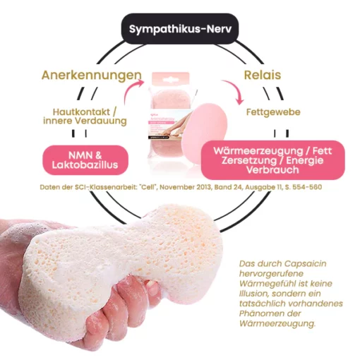 Der Schwamm enthält 2 natürliche Inhaltsstoffe, die vom Körper über die Haut aufgenommen werden und die das sympathische Nervensystem aktivieren. Dies wiederum trägt dazu bei, den Stoffwechsel des Körpers zu erhöhen, was zu einer Steigerung der Geschwindigkeit führt, mit der der Körper Kalorien und Fett verbrennt.