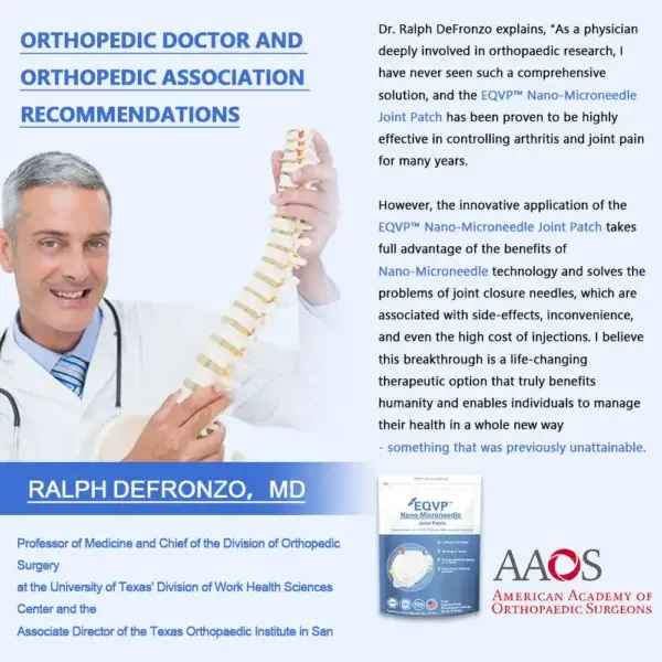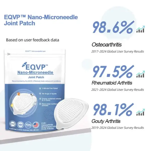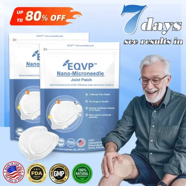 The EQVP™ Nano-Microneedle Joint Patch helps reduce joint pain and swelling by gently delivering medicine through tiny needles, working all day without causing discomfort.