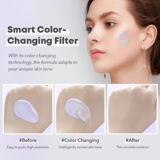 - Smart Color-Changing Filter – Experience a seamless skin matching with this versatile primer! With its color-changing technology, the formula adapts to your unique skin tone – so no need to worry about pilling or a cakey or mismatched finish. The filter provides amazing color correction that brightens your complexion, corrects uneven skin tones, and reduces redness, ensuring your flawless makeup stays put all day.