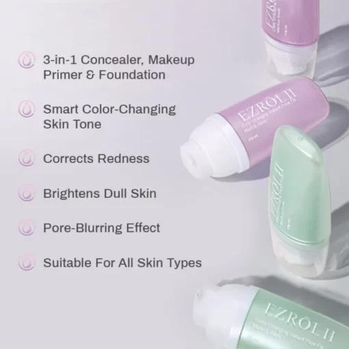 Achieve an all-day, flawless complexion with the EZROLII™ Color Changing Instant Pore Fix Primer! Our innovative 3-in-1 primer is designed to make your makeup routine easier with its color-matching technology, leaving your skin looking its absolute best.
