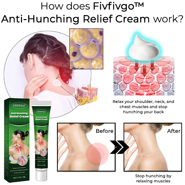 Hunching often stems from muscle tension and stiffness in the upper body, which forces your spine into an unnatural curve. Fivfivgo™ Anti-Hunching Relief Cream works by deeply penetrating the muscles in your shoulders, neck, and chest, relieving tightness and stress. As your muscles relax, your body can more easily maintain proper alignment, reducing the urge to hunch forward. By soothing your muscles and encouraging better posture, Fivfivgo™ helps you break the cycle of slouching and discomfort.