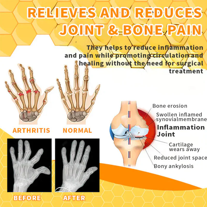 Laut Statistik leiden 38 Prozent der Weltbevölkerung an Gelenkproblemen, wobei jeder Fünfte an einem gewissen Grad an Gelenkproblemen leidet. Zu den milden Erkrankungen gehören Arthritis, Rheuma und Gicht, die durch Symptome wie Schmerzen, Steifheit, Schwellung, Bewegungsschwierigkeiten, Müdigkeit und eingeschränkte Bewegungsfreiheit gekennzeichnet sind. Schwere Erkrankungen können zu Gelenkdeformitäten, Fieber und starken Gelenkschmerzen führen, was zu langfristigen Schmerzen und Behinderungen führt. Im Extremfall können orthopädische Zustände sogar zu lebensbedrohlichen Komplikationen führen. Gelenkprobleme sind ein großes Problem für Millionen von Menschen und betreffen fast 40% der Weltbevölkerung. Dazu gehören Erkrankungen wie Arthritis, Rheuma und Gicht, die Schmerzen, Steifheit, Schwellungen und eingeschränkte Bewegungsfreiheit verursachen können. In schweren Fällen können Gelenkprobleme sogar zu schwerwiegenden Komplikationen führen, die langfristige Schmerzen und Behinderungen verursachen. Mit Fivfivgo American honey Bienengift Schmerz- und Knochenheilungs-Creme können Sie Linderung und Heilung von Gelenkproblemen finden und Ihre allgemeine Lebensqualität verbessern.