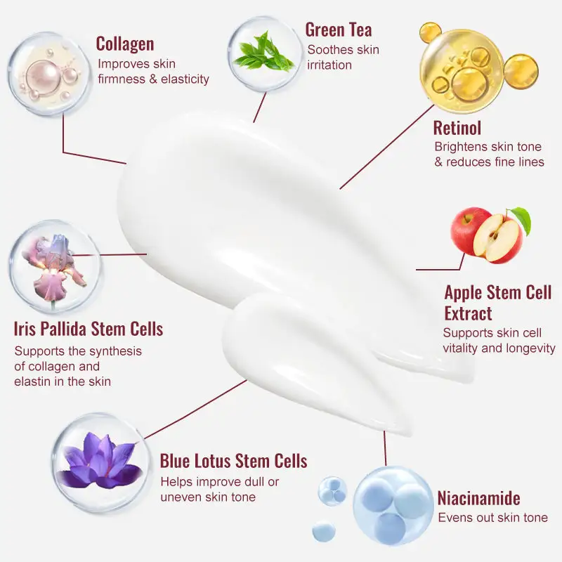 Function: Retinol is a well-known anti-aging ingredient with significant skin-repairing effects. It promotes skin cell turnover, improves cell metabolism, and reduces the accumulation of aging cells, which helps reduce fine lines and wrinkles. Retinol also stimulates collagen synthesis, improving skin elasticity and firmness, and enhancing overall smoothness. Additionally, it helps even out skin tone, lightens dark spots, and improves skin radiance.