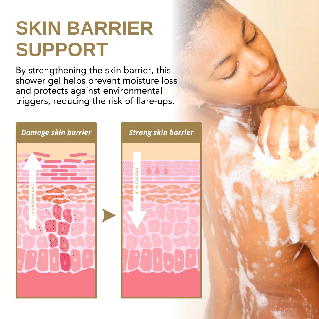 Unterstützung der Hautbarriere: Durch die Stärkung der Hautbarriere beugt dieses Duschgel Feuchtigkeitsverlust vor und schützt vor Umwelteinflüssen, wodurch das Risiko von Schüben verringert wird.