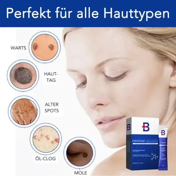 Fivfivgo® Freeze Zap Warze Fortgegangen Serum wirkt, indem es die Wirkung einer professionellen Kryotherapie nachahmt, indem es den Kern der Warze oder des Hautanhängers einfriert, um die Blutzufuhr zu unterbrechen und die natürliche Ablösung auszulösen. Gleichzeitig dringt die Mischung aus pflanzlichen Inhaltsstoffen wie Teebaumöl, Centella Asiatica und Hyaluronsäure tief in die Haut ein, um das Virus zu bekämpfen, Entzündungen zu lindern und die Regeneration von gesundem Gewebe zu fördern. Dank dieses doppelten Wirkprinzips kann der Pickel austrocknen, schrumpfen und auf natürliche Weise abfallen – ohne Schmerzen, Narbenbildung oder Schädigung der umliegenden Haut.