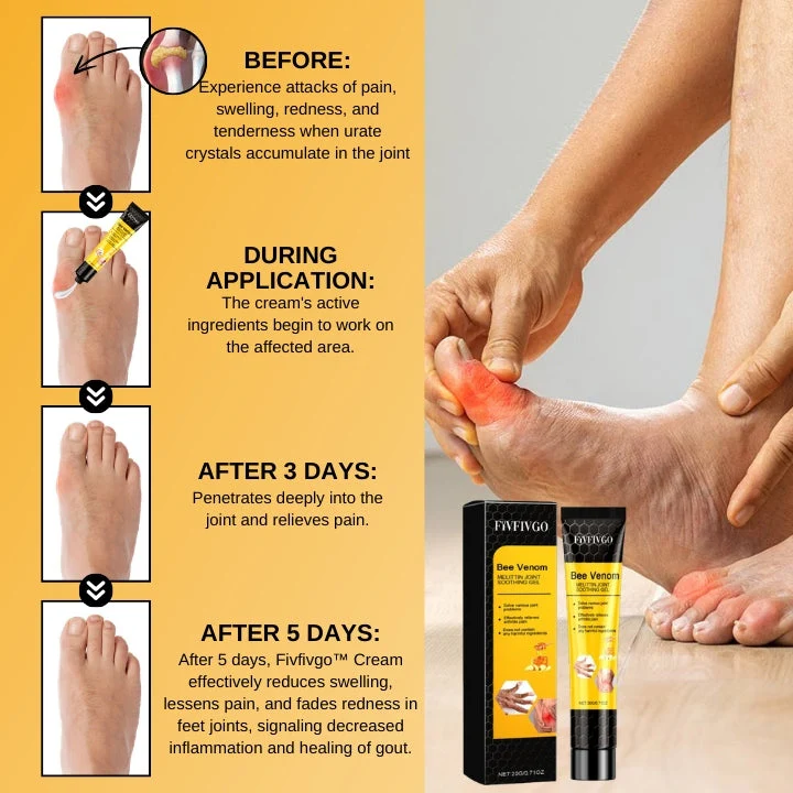 Lindern Sie Ihre Gichtschmerzen mit Fivfivgo™ GoutEase Bienengift-Creme! Diese wirksame Creme bekämpft Gicht an Füßen, Fingern und Gelenken und sorgt für eine schnelle und effektive Linderung. Verabschieden Sie sich von Gichtschmerzen und -beschwerden und freuen Sie sich auf ein angenehmes, schmerzfreies Leben mit Fivfivgo™ GoutEase Bienengift-Creme.