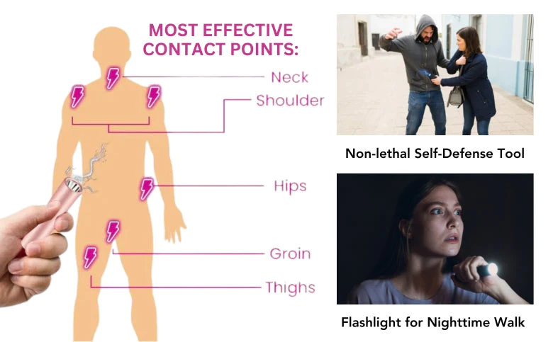 - Drücken und halten: Drücken Sie den Aktivierungsknopf, um den starken Elektroschock auszulösen und die Umgebung mit der eingebauten Taschenlampe zu beleuchten. Lassen Sie die Taste los, um sie zu deaktivieren.