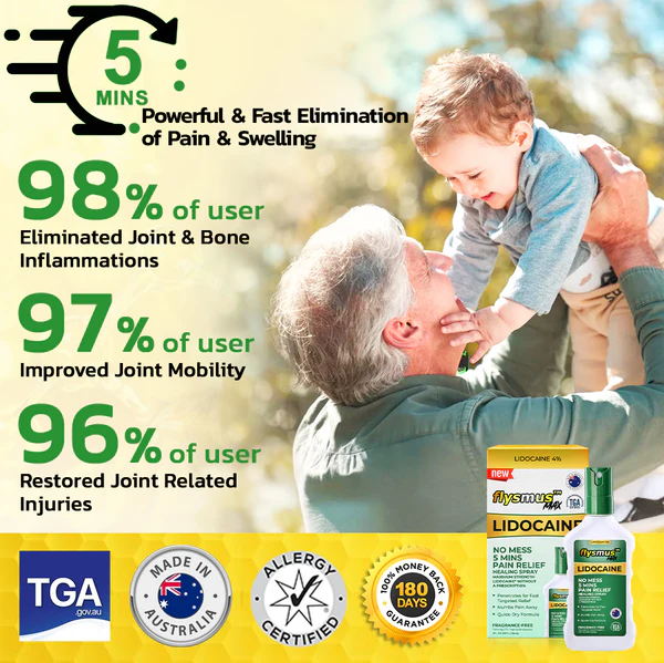 Try flysmus™ Lidocaine 5Mins Pain Relief Healing Spray today and experience the difference yourself. Say goodbye to joint pain, inflammation, and discomfort, and enjoy a more active, pain-free life!