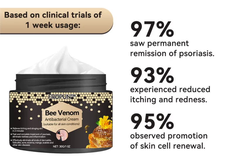 - Reduce flaking, redness and dryness while relieving itching with this Fropun™ Bee Venom Antibacterial Cream. Fight seborrheic dermatitis while restoring the healthy appearance of your skin with Psoriasis Treatment Cream! Fropun™ Bee Venom Antibacterial Cream improves the appearance of the skin by balancing the immune system and eliminating scales. In return, skin irritation is reduced and the formation of new skin cells is reduced. It has a positive effect on skin and heart health.
