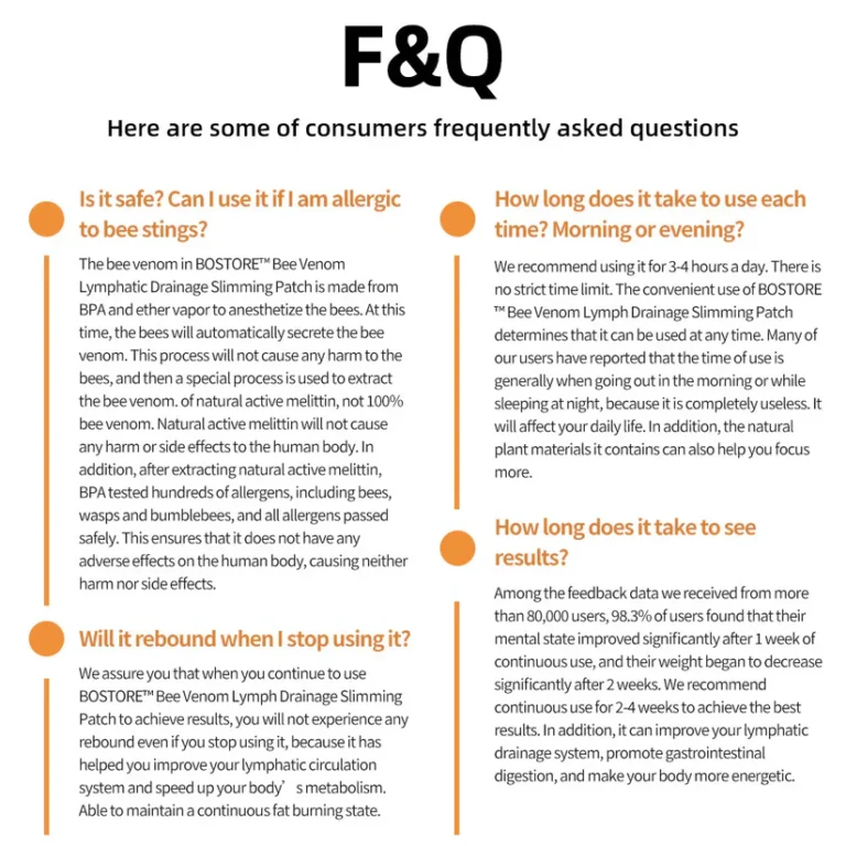 I have combined various botanical ingredients, long known for their benefits to the lymphatic system and body metabolism, to create Furzero™ Bee Venom Detox Slimming Patch. Experimental evidence indicates that this lymphatic drainage slimming patch is the optimal choice for improving the lymphatic system.The blend of these natural botanical ingredients, coupled with the potent properties of bee venom, offers a groundbreaking solution for swiftly addressing metabolic disorders and lymphatic congestion issues.