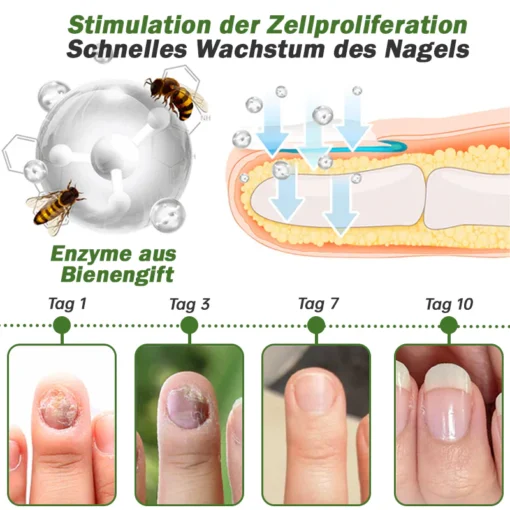 Die spezielle Formel enthält antimikrobielle Verbindungen, die helfen, Pilz- und bakterielle Infektionen zu bekämpfen und stärkere Nägel zu fördern, die weniger bruchanfällig sind. Darüber hinaus enthält Bienengift entzündungshemmende Substanzen, die Entzündungen im Nagelbett reduzieren, Schutz bieten und langfristige Prävention von Infektionen fördern.