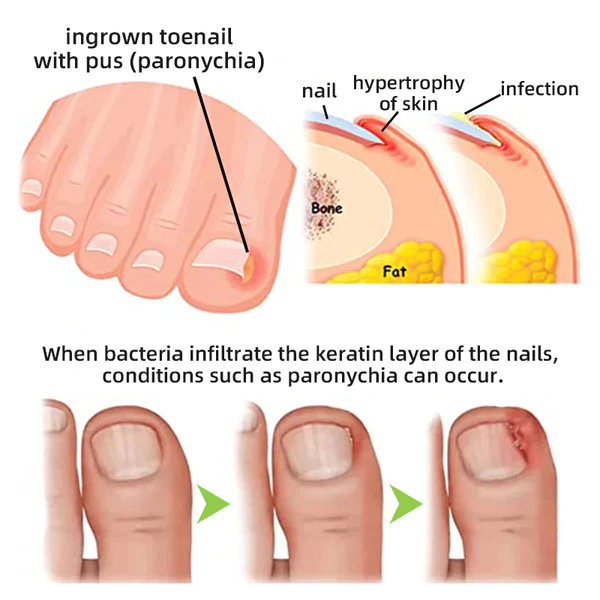 Conditions like paronychia and fungal infections arise when bacteria infiltrate compromised skin near the nail’s cuticle and fold, leading to infections.