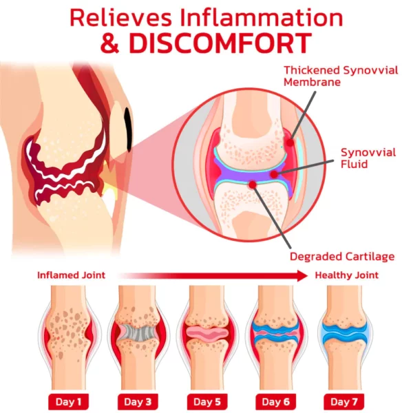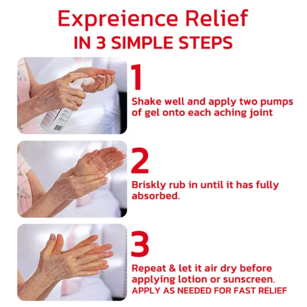 Upon application of the relief gel to the affected area, it permeates the skin and delivers its active components to the targeted joint. Working in synergy, these components effectively mitigate pain, inflammation, and promote the healing process.