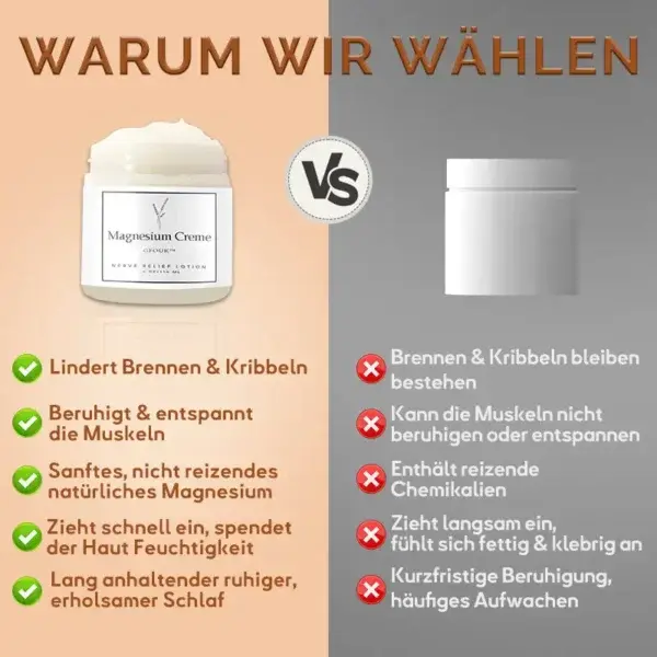 Dann ist unsere Magnesium Nervenlindernde Schmerzlotion genau das Richtige für Sie! Wir haben eng mit führenden Experten im Bereich Schmerzmanagement und Neurologie zusammengearbeitet, um ein revolutionäres Produkt zu entwickeln, das die starke schmerzlindernde und heilende Kraft von Magnesium nutzt. Die Magnesium Nervenlindernde Schmerzlotion ist der perfekte Booster, um Ihnen zu helfen, gegen verschiedene Schmerzen und Beschwerden anzukämpfen, damit Sie ein schmerzfreies, gesundes Leben führen und den Komfort und die Energie jedes Tages genießen können.