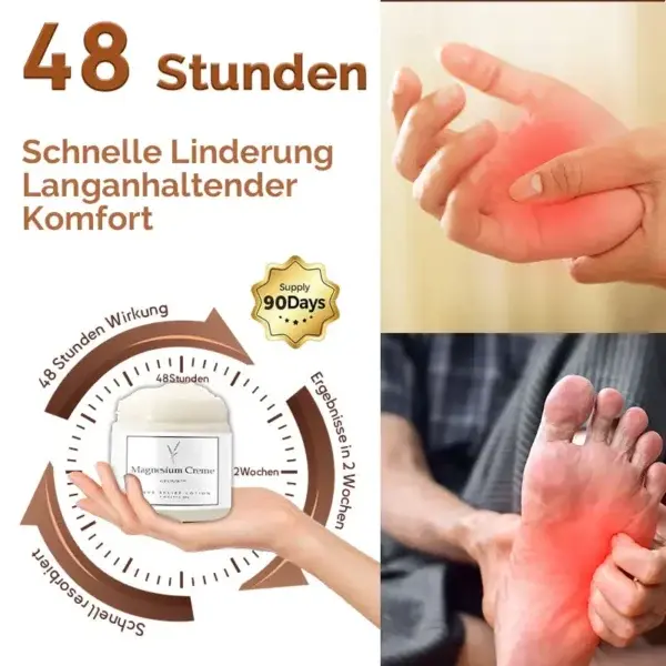 Durch die tägliche Anwendung der Magnesium-Schmerzlinderungs- und Heilcreme haben Ihre Hände und Füße die Chance, sich zu erholen und zu heilen.