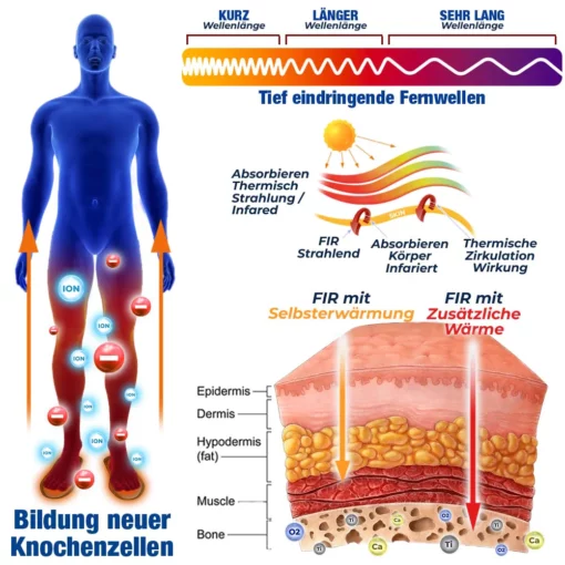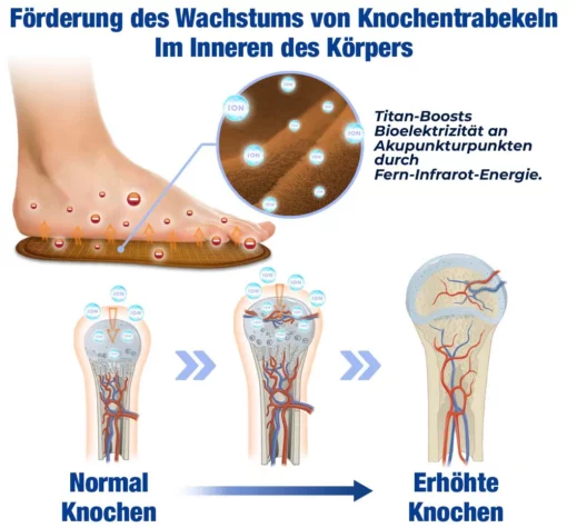 Unsere innovativen Einlegesohlen bieten eine außergewöhnliche Verschmelzung von FIR-Therapie und Ionen-Technologie, mit einem zusätzliches Heizelement die Ihr Wellness-Erlebnis auf die nächste Stufe hebt. Die zusätzliche Wärme dringt tief in das Gewebe des Körpers ein. Diese verstärkte Penetration geht jenseits der Oberfläche, bis auf die Knochen. In diesen Knochen kommen die in der FIR-Therapie verwendeten Titanelemente voll zur Geltung. Die tiefgreifende Wärme und die aktivierten Titanelemente wirken zusammen, um die Versorgung Ihrer Knochen mit Sauerstoff und lebenswichtigen Nährstoffen zu optimieren. Diese Synergie spielt eine entscheidende Rolle bei der Pflege Ihrer Knochen und hilft bei der Bildung von neue Knochenzellen, und einen Beitrag zur Wiederherstellung und Wiederaufbau von Knochenstrukturen.