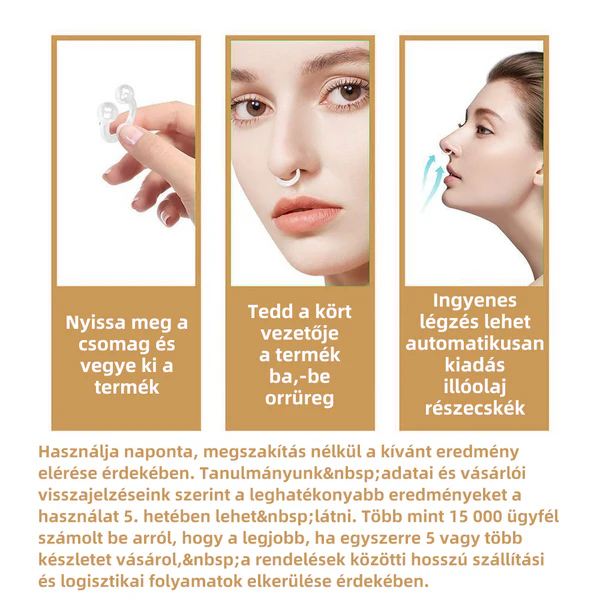 1. Vegye ki az orrgyűrűt a csomagolásából, helyezze az orrára, vegyen egy mély lélegzetet és élvezze.