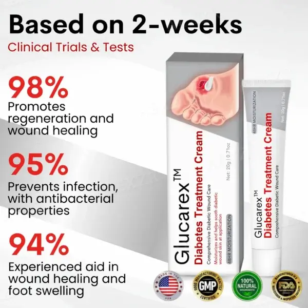 Extensive clinical trials have proven the effectiveness of Glucarex™ Diabetes Treatment Cream in accelerating healing and improving circulation for individuals with diabetic wounds and foot complications. In a controlled study of 100 diabetic patients with foot ulcers, swelling, and neuropathic pain, those using Glucarex™ experienced a 94% reduction in inflammation within a week. By the end of the two-week trial, 98% reported significant wound healing.