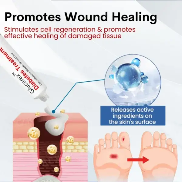 Glucarex™ Diabetes Treatment Cream works by creating the ideal environment for wound healing through a multi-faceted approach. Upon application, the cream forms a protective barrier over the wound, shielding it from bacteria and external contaminants that could lead to infection. At the same time, this barrier helps maintain optimal moisture levels, preventing excessive dryness that can slow down healing. Proper hydration is essential for skin regeneration, allowing the wound to close more efficiently while reducing the risk of complications.