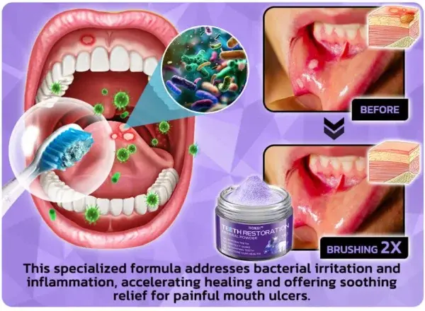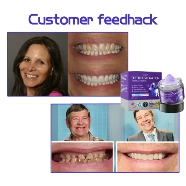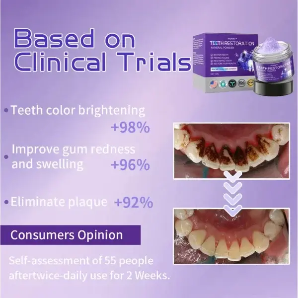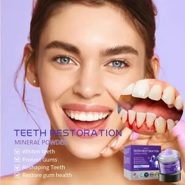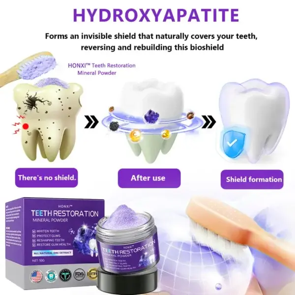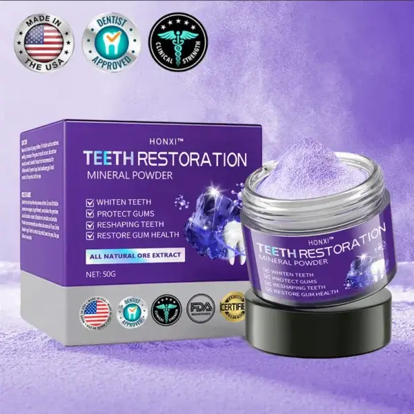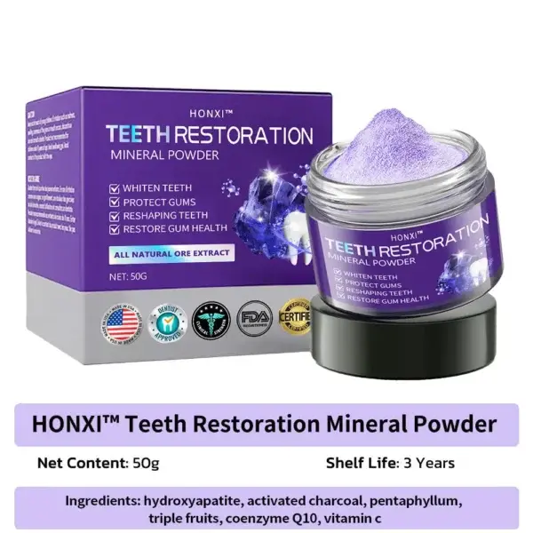 Honxi™ Teeth Restoration Mineral Powder eliminates 99.99% of bacteria, resolves bad breath, removes plaque and tartar, treats gingivitis and periodontitis, relieves toothache, prevents and treats cavities, restores tooth enamel, stimulates reparative dentin formation, and supports the regeneration of lost teeth.