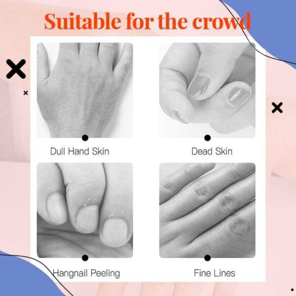 【Suitable for the crowd】 Dry skin, oily skin, mixed oil/mixed dry, neutral, and other skin types. It is aimed at improving the problem of hand skin such as fine lines, dark yellow roughness, dry cracking, barb, and calluses on the hands.