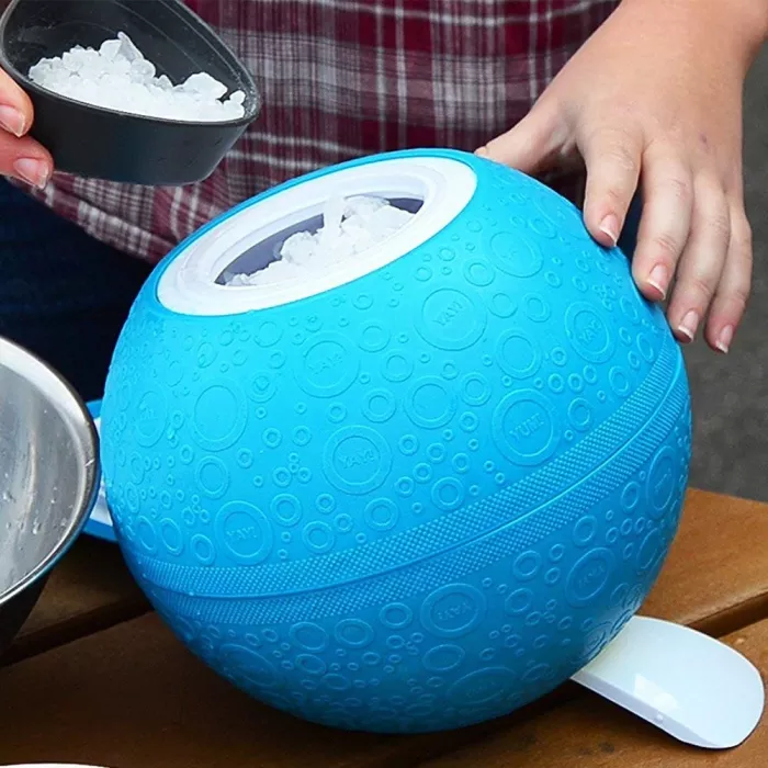 - Simply add cream, sugar, and flavorings in one end, and add ice and rock salt in the other end. Roll for 20-30min of play and serve