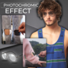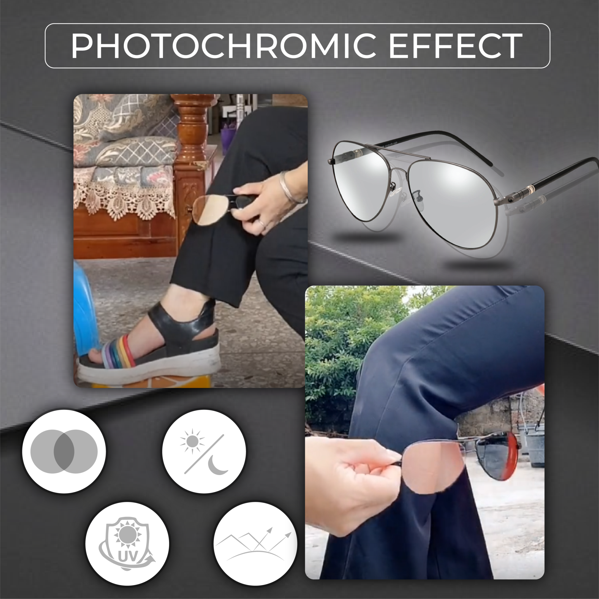 It has a LIGHT-SENSITIVE CHIPS and LIQUID CRYSTAL LENS that PROVIDES a MAGICAL PHOTOCHROMIC LENSES that BASES the INTENSITY of SUNLIGHT and ULTRAVIOLET LIGHT that DARKENS the LIGHT through GREY LENS. The LIGHT has the EFFECT of DIMMING or BRIGHTENING the GLASSES SIGNIFICANTLY.