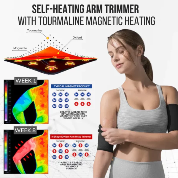 Heat therapy provided by InShape IONism Arm Wrap Trimmer is a non-invasive method that can selectively target adipose tissue through the application of thermal energy. The principle behind this technique is based on the fact that adipose tissue is more sensitive to heat than other surrounding tissues, allowing for the selective targeting of fat cells. The liquefaction of adipose tissue occurs at lower temperatures than those required for thermal injury of surrounding tissue, resulting in minimal injury to surrounding skin and tissue. The results of this therapy may take several weeks to become apparent as the body gradually eliminates the liquefied fat via metabolic pathways.