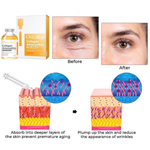 Oveallgo™ FirmTox Collagen Astaxanthin Lifting Ampoule works by providing the skin with powerful anti-aging ingredients that target the underlying causes of wrinkles and other signs of aging. The high-quality ingredients in our formula work together to stimulate collagen production, which is essential for maintaining the skin’s elasticity and firmness. This helps to plump up the skin and reduce the appearance of fine lines and wrinkles, giving you a more youthful and radiant complexion.