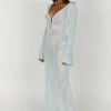 This is a crochet maxi dress with flared sleeves, a deep V-neckline, and a deep, rounded V-neckline at the back. There are two keyhole cut-outs in the front centre fastened with two MESHKI gold bar hardwares for a little extra bling. The long, flared sleeves and raw, floor-sweeping hem add full-coverage drama without looking overdone. The see-through, mesh-like fabrication is spun from an acrylic-and-cotton fabric blend for optimal comfort.