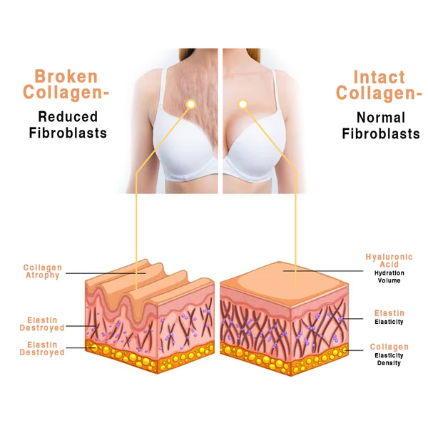 As we grow older, the body’s innate production of collagen and elastin dwindles, both of which are vital for upholding the firmness and flexibility of the skin in the chest region. This inherent aging progression can lead to the development of wrinkles and the drooping of the breasts.