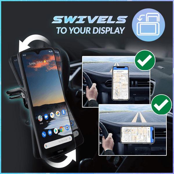 Rotates smartphone and swivel display easily. The base of the mount remains fixed into the air vent tightly.