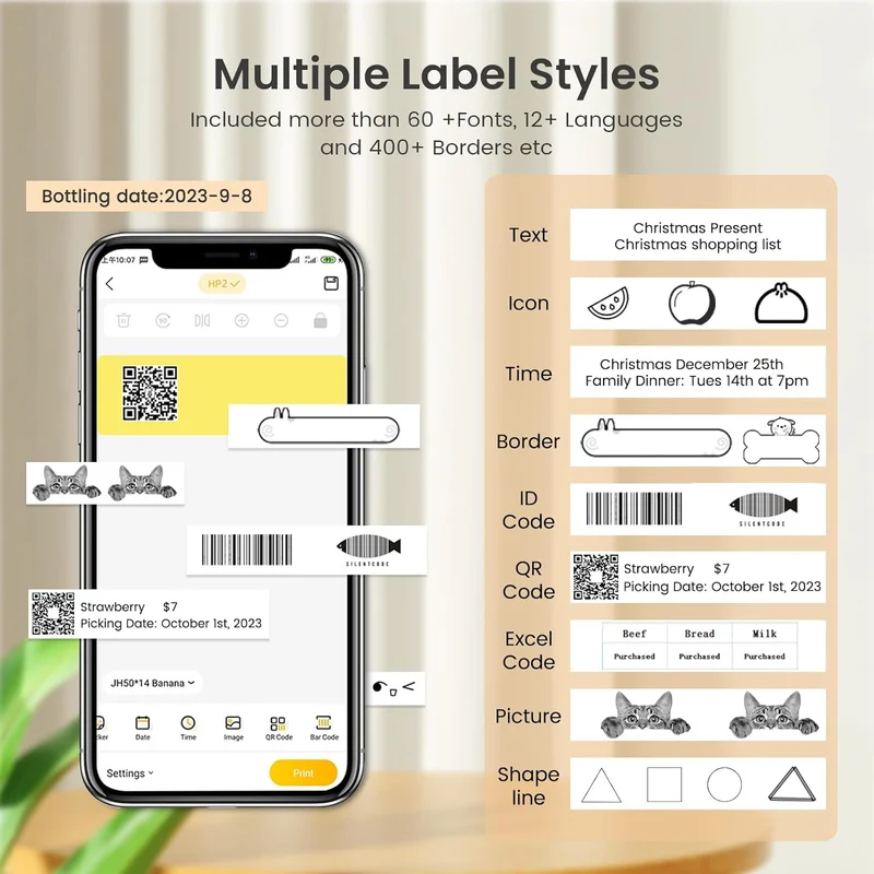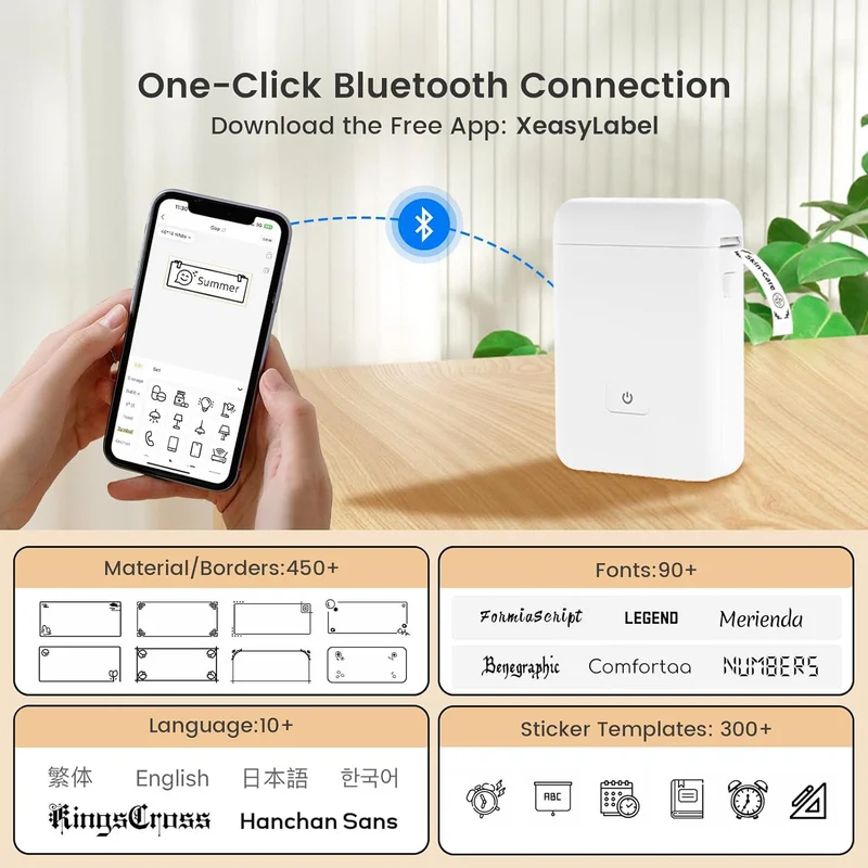 • Multiple Creative Function & Templates: Just need to download the free app – “Xeasylabel”. The app is wide variety of pre-designed templates, included more than 800+ symbols, 100+ frames, 30+fonts, 12+ languages. Easy to create various design stickers label for office ,home etc.(NOTE: This label maker doesn’t work with computers and tablet)