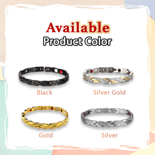 Lady’s Magnetic Slim Therapy Bracelet has an ELEGANT HIGH-FASHION DESIGN that GOES WELL PERFECTLY with ANY OUTFIT such as Casual, Evening Gowns, Formal Wear, Dress, Party Outfit and more. It is PROVEN to be SAFE and EFFECTIVE. It is LIGHTWEIGHT and GUARANTEED to DELIVER FAST RESULT. It comes in FOUR COLORS: Silver, Gold, Silver Gold, and Black. It is RECOMMENDED for WOMEN who wants to LOSE WEIGHT FAST and EASILY.