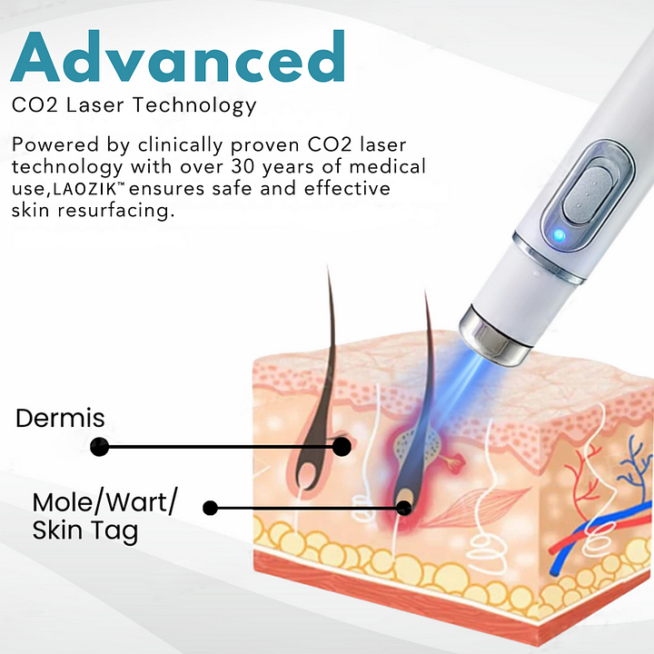 LAOZIK® Non-Invasive Mole and Wart Removal Laser Pen utilizes state-of-the-art CO₂ laser technology, a gold-standard in dermatology with over 30 years of clinical history. As one of the first FDA-approved skin resurfacing treatments, it is designed to provide safe, precise, and effective removal of moles, warts, dark spots, and other skin imperfections.