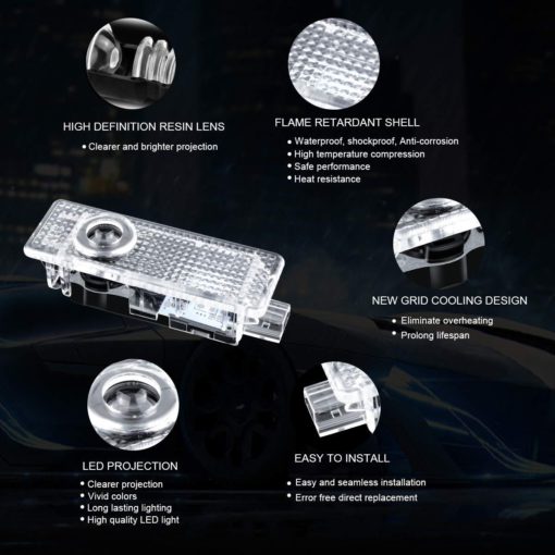 - 👉INSTALLATION EFFECT: When you open the car door,you will see the Bright and vivid logo light projects on the ground. it will be turn off when you close the door.