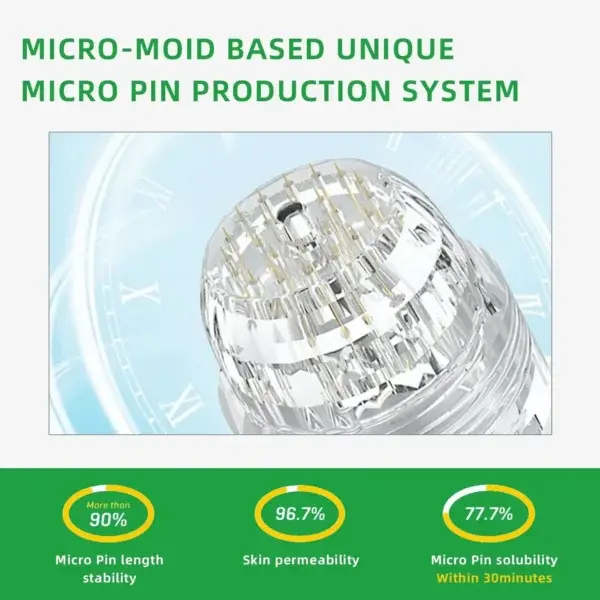 Each needle is 0.27mm long, just 1/7th the thickness of a hair, and is made from dissolvable medication. These micro-needles are precision-engineered using cutting-edge manufacturing techniques to ensure a seamless, pain-free experience while effectively delivering the active ingredients directly into the skin.