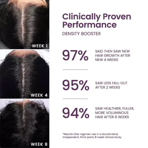 Results after regimen (including Liascy™ Flourish Hair Density Spray) use in a double blind, independent, third-party 6 month clinical study of 30 women. 97% of women saw new hair growth after 3 months, 94% saw healthier, fuller, more voluminous hair after 2 months, 95% saw less fall-out after 2 weeks.