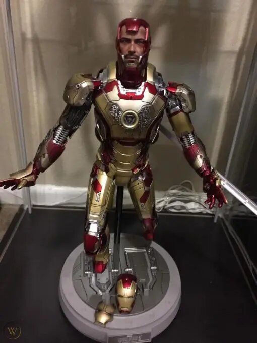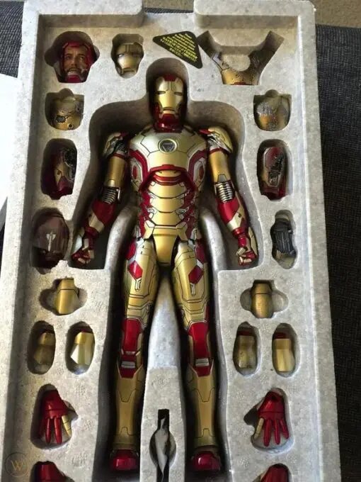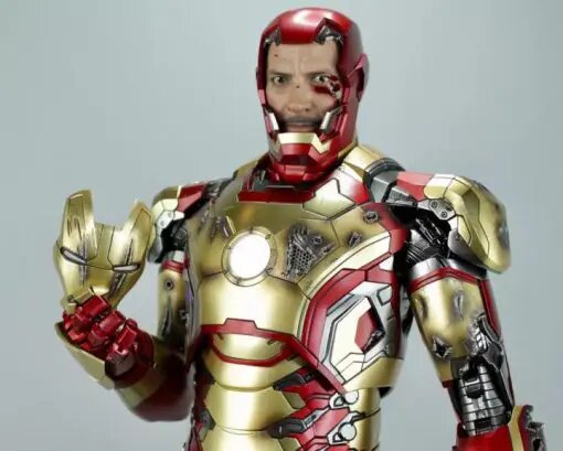 – Battle damaged head sculpt with helmet with authentic likeness of Robert Downey Jr. as Mark XLII in the movie